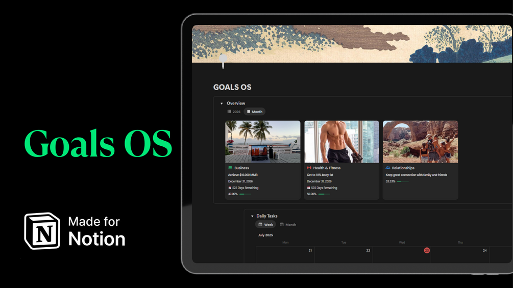 This all-in-one Notion template helps you stay focused daily, monthly, and yearly. Whether you're building new habits, staying on top of tasks, or tracking your vision, this system gives you full control and clarity.