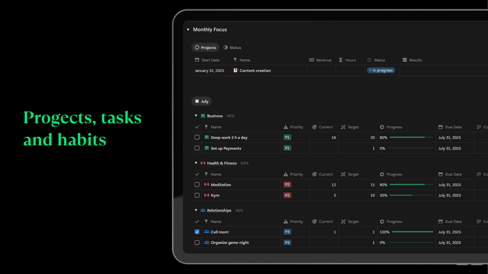 Organize side projects, business ideas, and content with statuses and results.